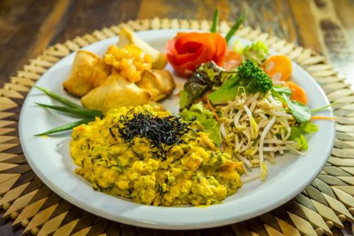 Lacto vegetariano com opções veganas, serve uma comida muito saborosa e criativa com pratos bem variados, num ambiente bonito, agradável e acolhedor. Procuramos equilibrar os cardápios e manter todos os nutrientes necessários para uma boa alimentação. Leguminosas, raízes, caules, folhas e frutos de cores e sabores variados com certeza compõem uma refeição completa e nutritiva. Alguns derivados do leite como queijos e iogurtes, e da soja, como tofu, aguê e shoyu, garantem a proteína que preocupa muitos vegetarianos.
